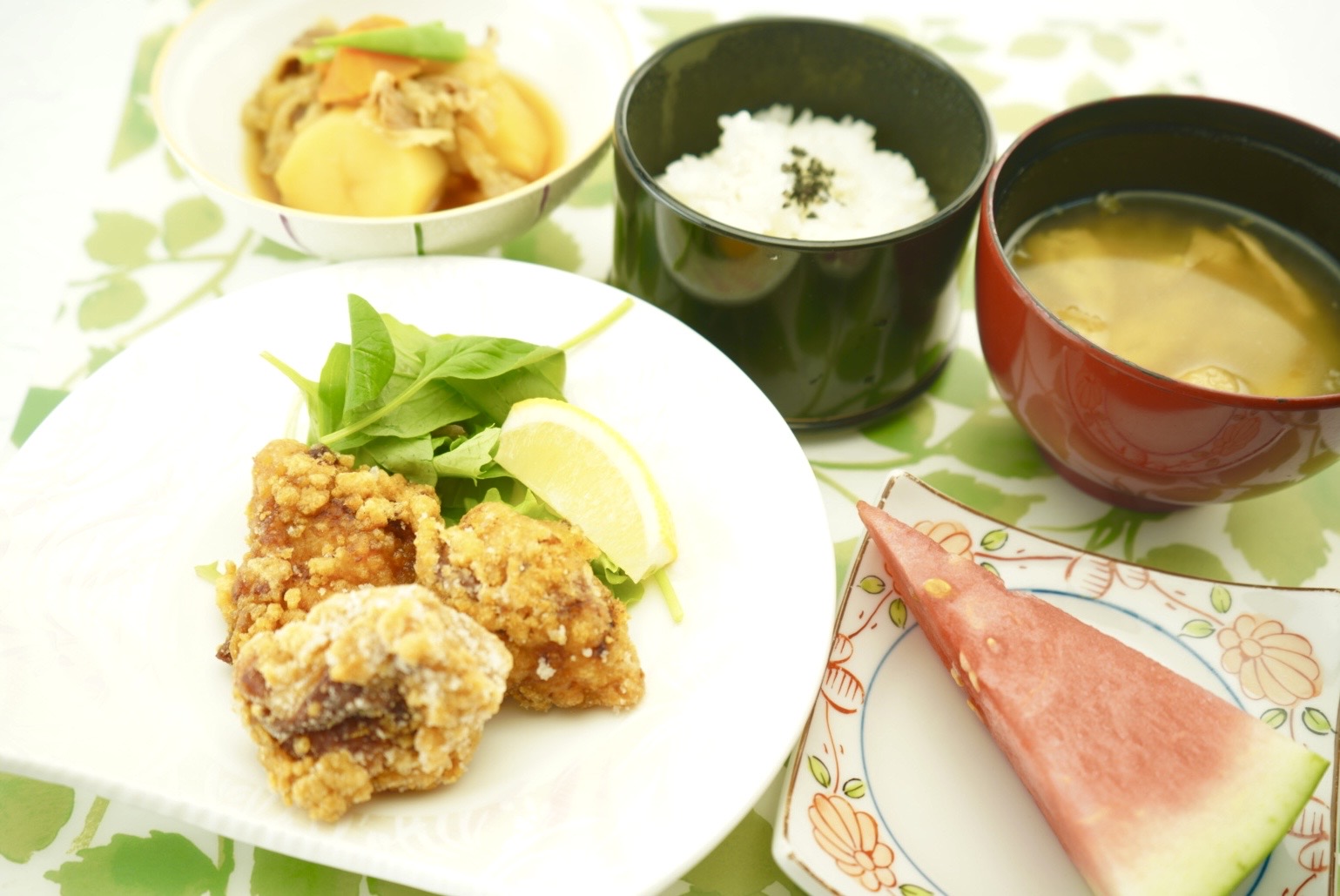 今日は、ハンバーグとしょうが焼き、サーモンのお刺身、のっぺい汁、かき氷をご用意しました。