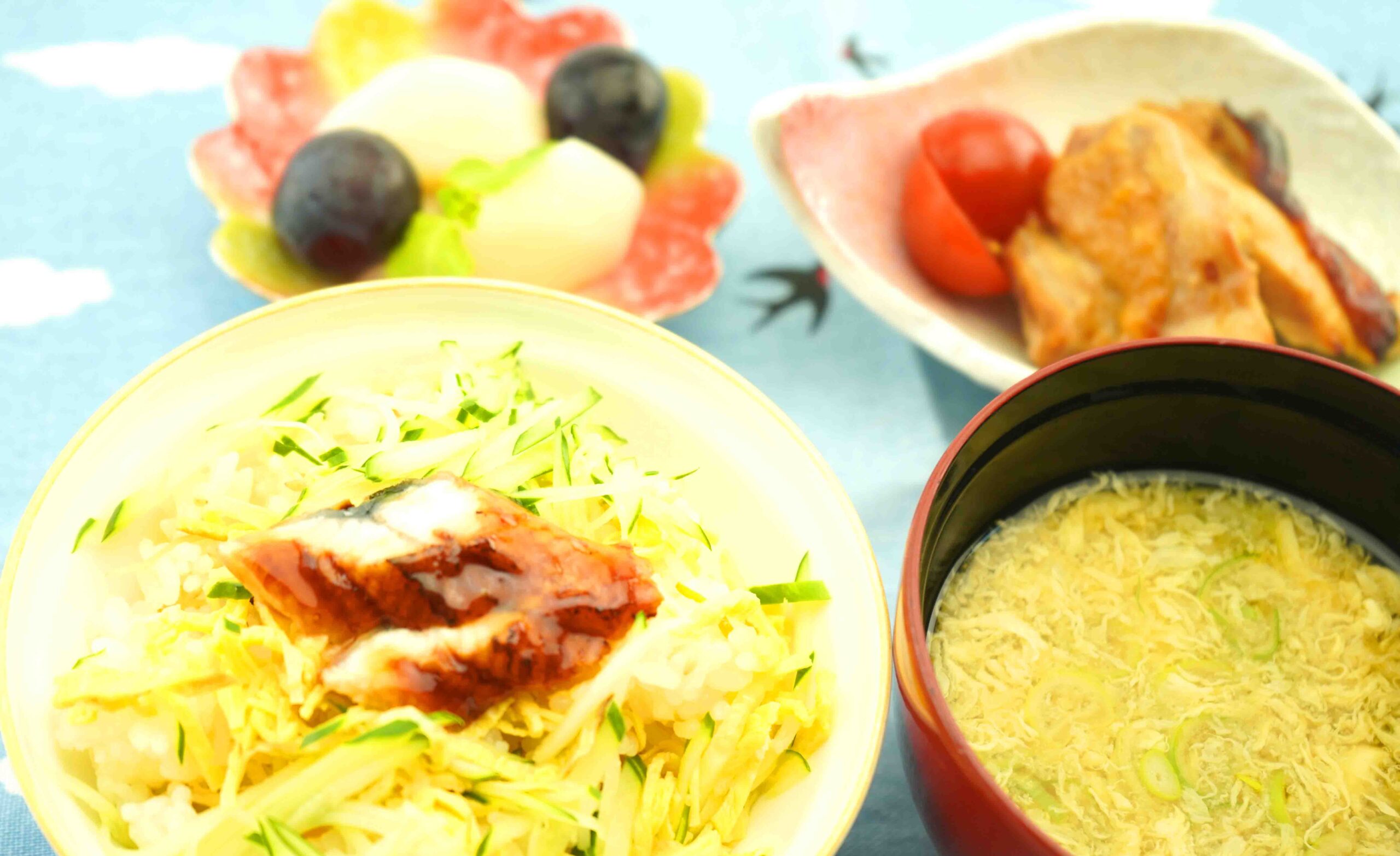 メニューは、うなぎちらしに鶏の照り焼き、かきたま汁、フルーツ盛り合わせです。