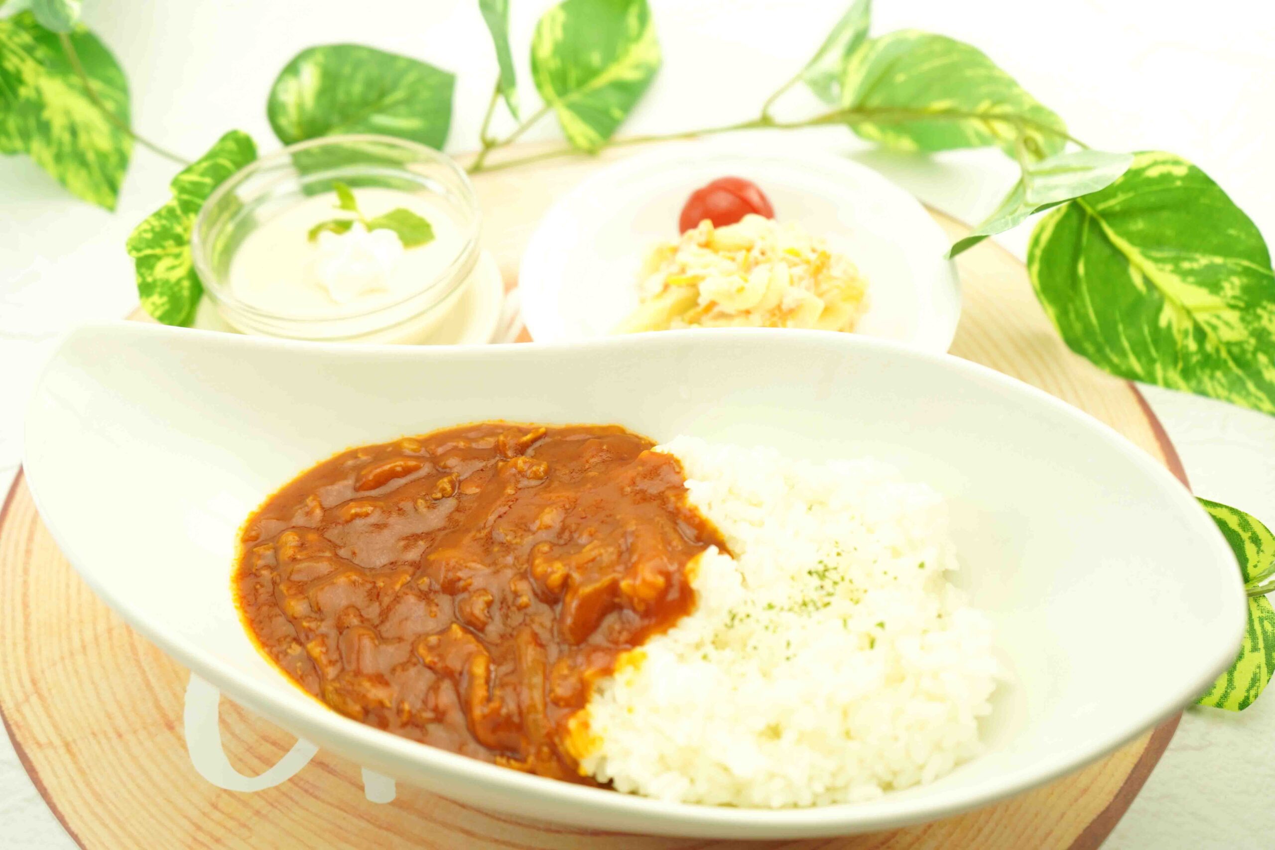 今日は、お肉たっぷりのハヤシライスとサラダ、デザートをご用意しました。