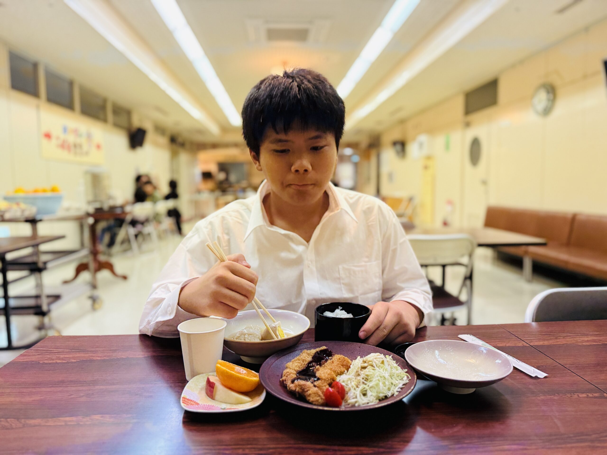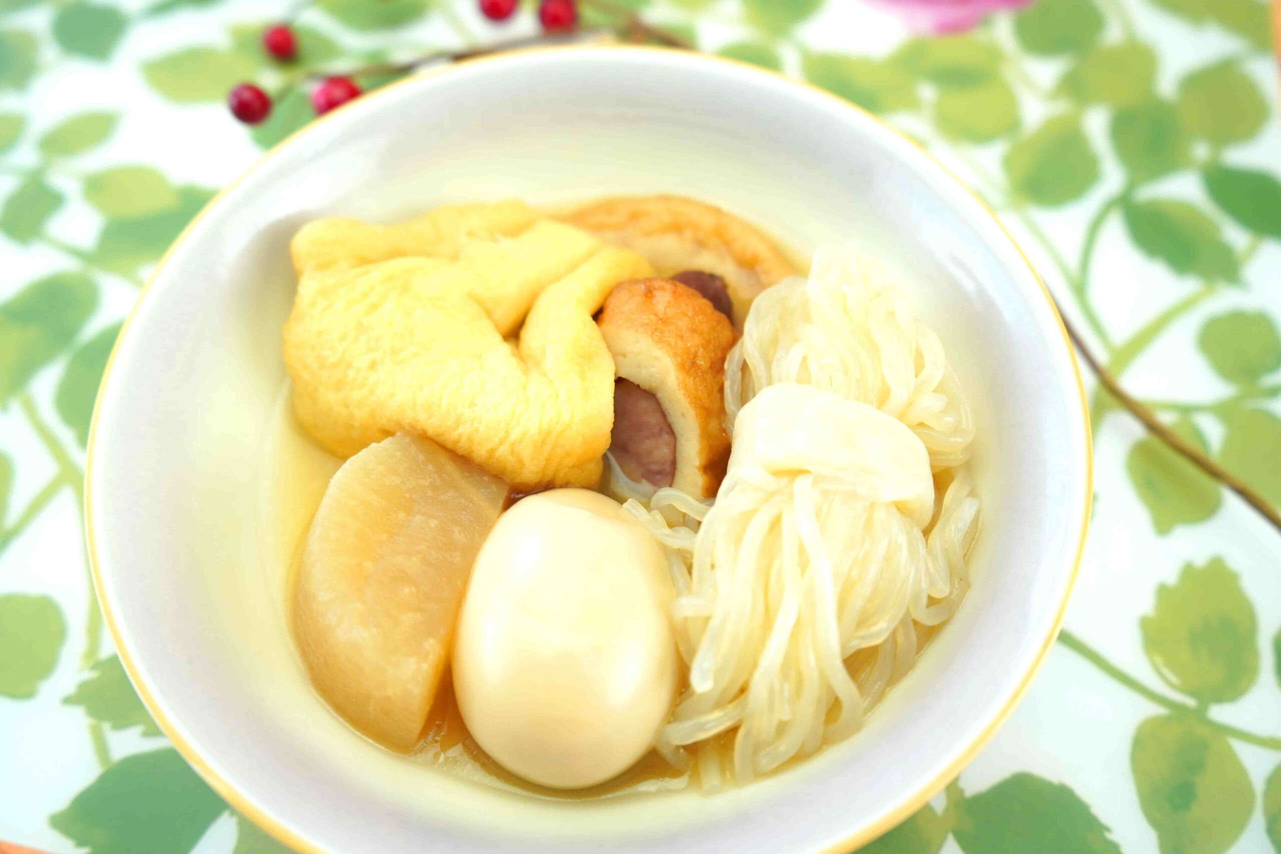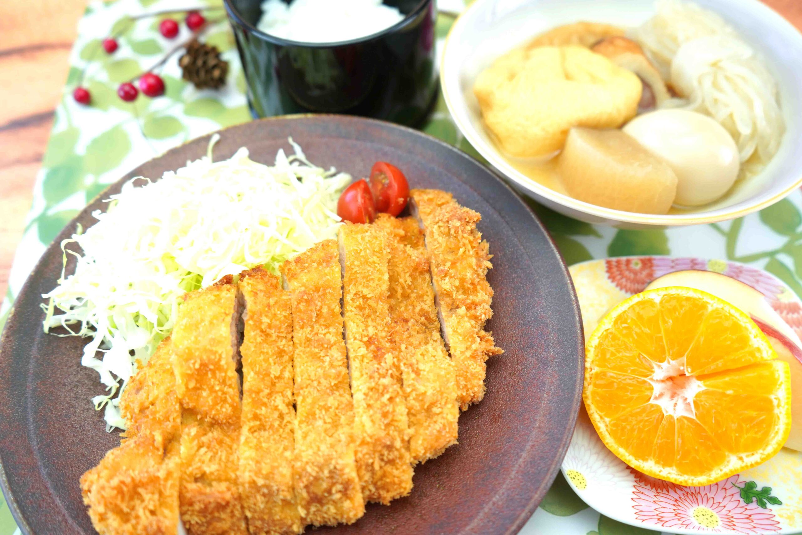 今日のメニューはトンカツにおでん、ご飯、デザートをご用意しました。