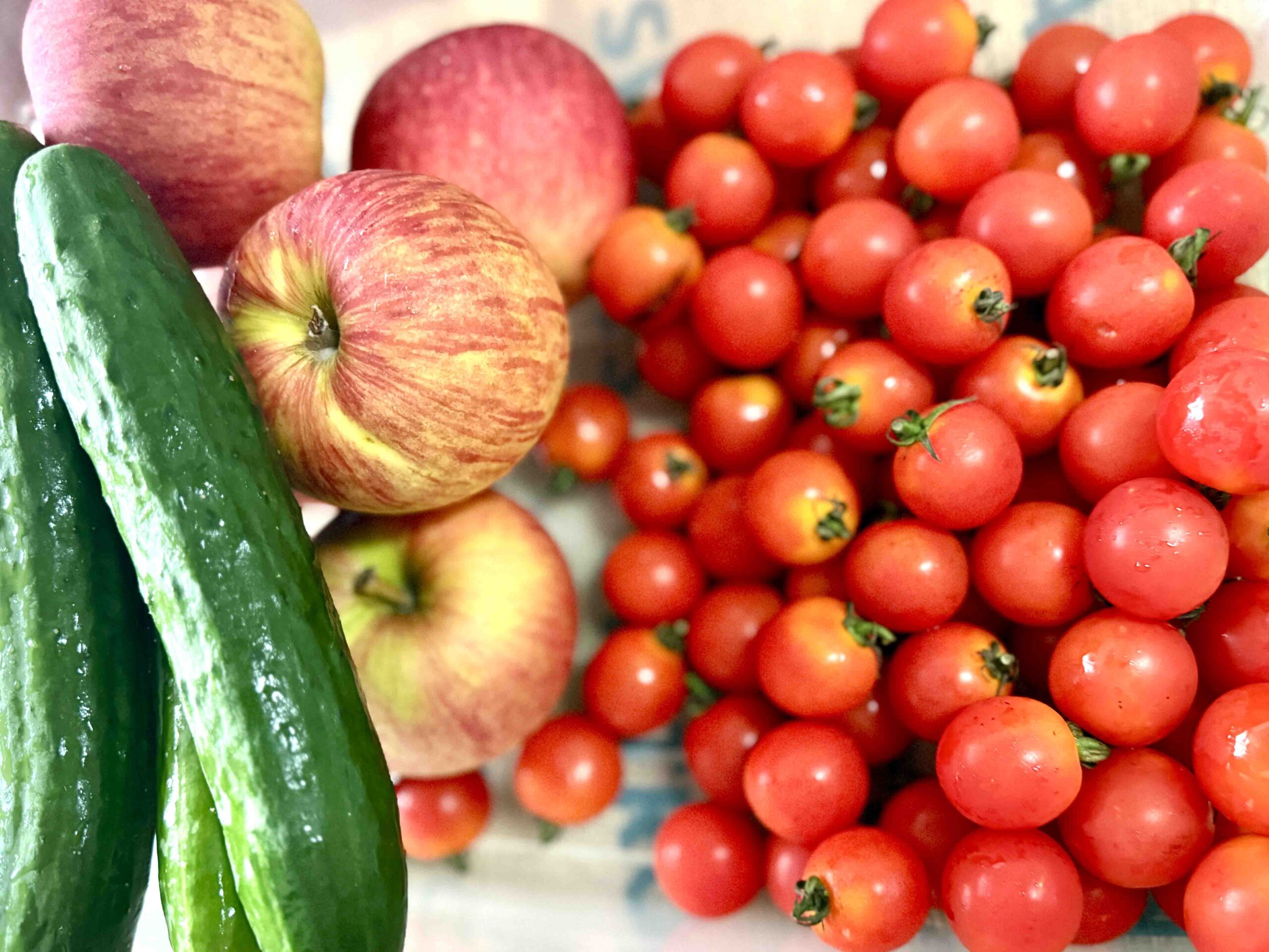 ミニトマトとキュウリ、リンゴはカネイチ様から頂きました。