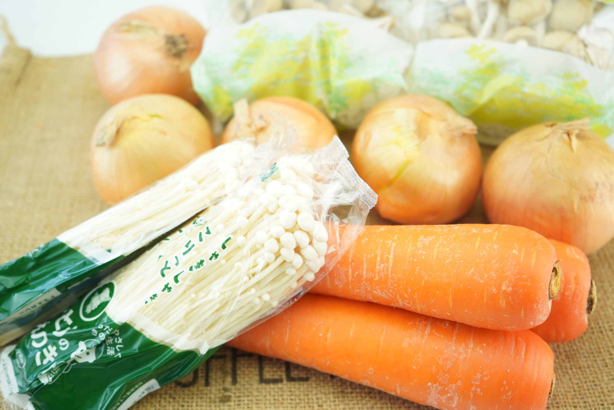 タマネギやニンジン、えのきだけ、本しめじは、カネイチ様より頂きました。