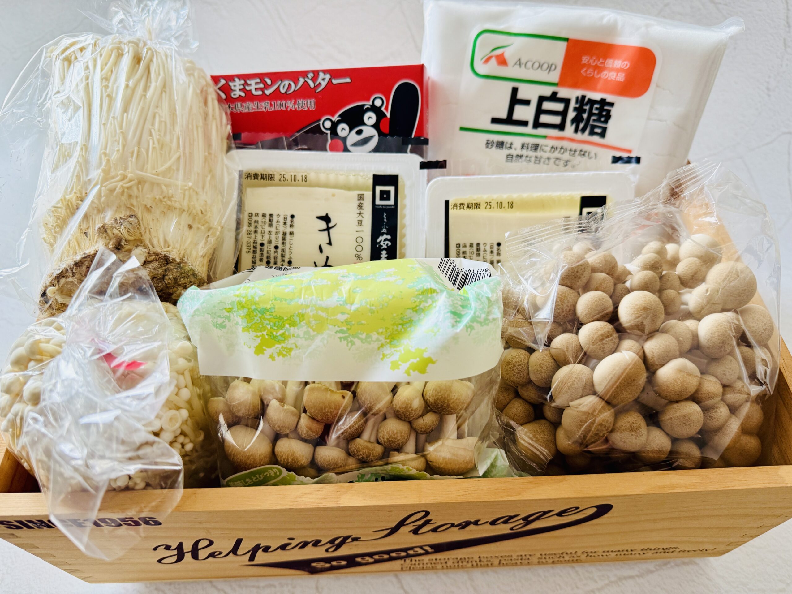 バターや豆腐、砂糖、しめじ、えのきだけ、ジャガイモはJAグループ熊本様から頂きました。