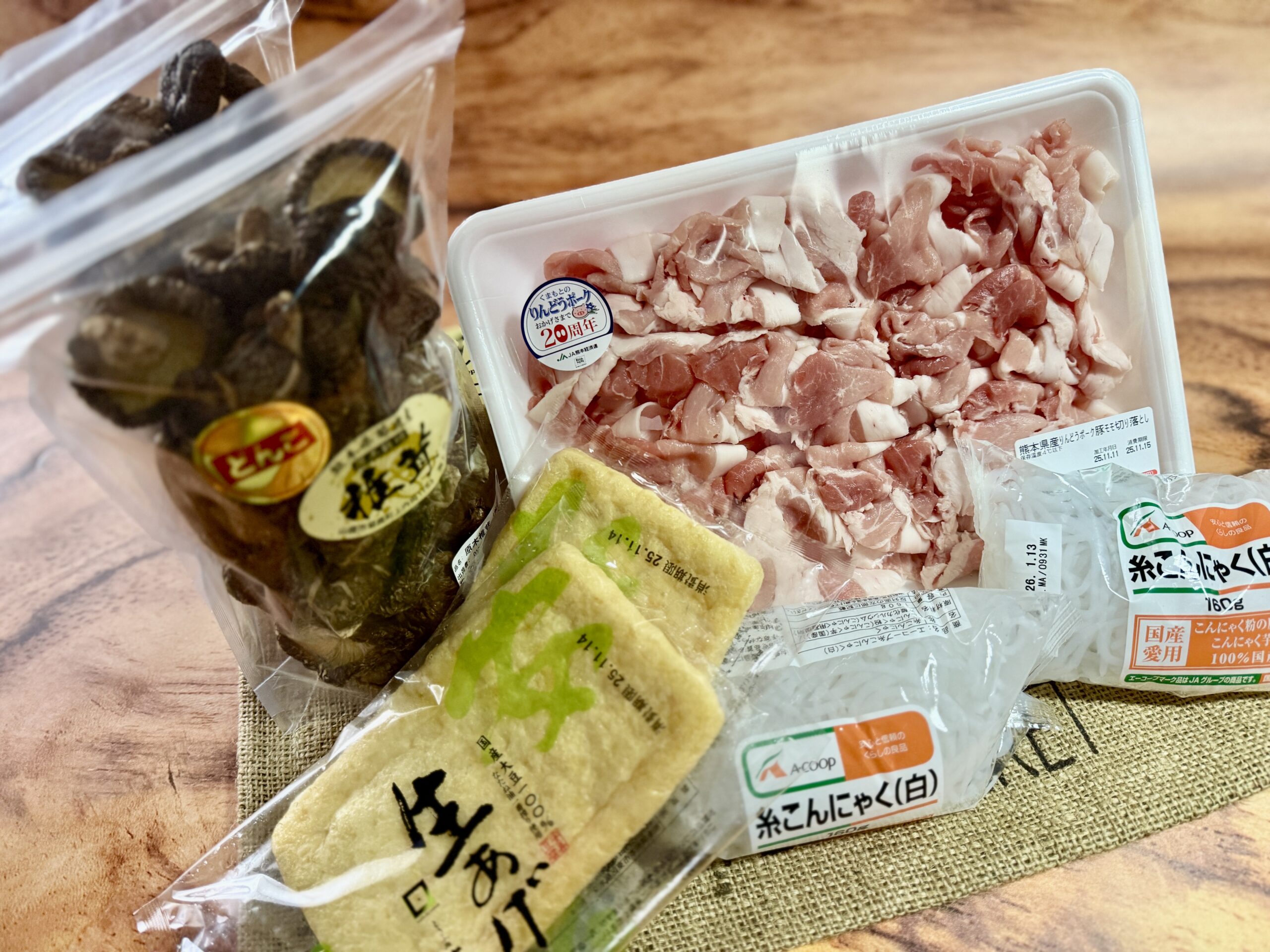 豚肉や生揚げ、しらたき、干しシイタケはJAグループ熊本様